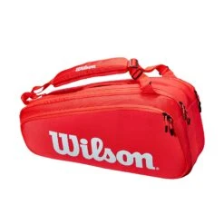 Superior quality, tennis-oriented functionality and classic design collide: introducing Wilson’s latest Super Tour bag collection. This bag comprises three main compartments that hold up to 6 rackets, two large exterior side pockets and a dual carry system for optimal transportation. New to the line are reinforced side panels, which provide extra durability at spots that typically rip first. Tennis players will also appreciate the Thermoguard lining in one main compartment that protects contents wilting from extreme heat.